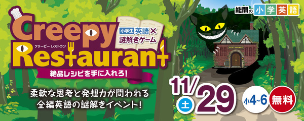 小学英語×謎解き『小学生』英語×謎解きゲーム! 今回の演目は 【Creepy Restaurant(クリーピー レストラン)】です。 柔軟な思考…