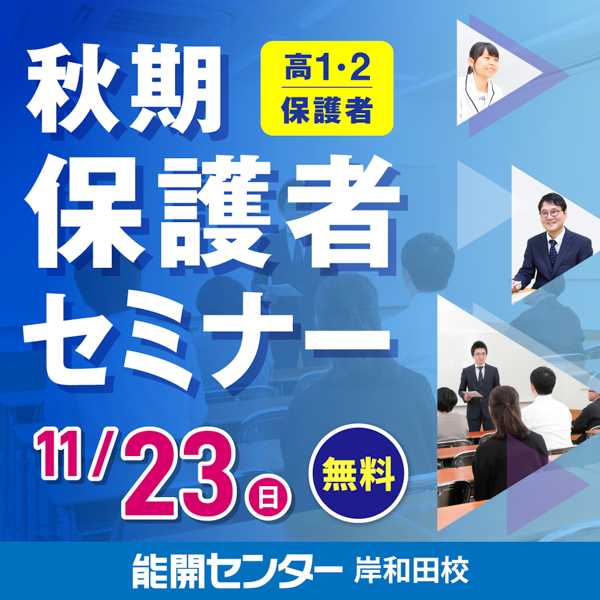 秋期 保護者セミナー高1・2秋から高3・3月までの、道のりや学習の進め方etc.を岸和田近隣の高校の実情を踏まえてお伝えいたします。入試情…