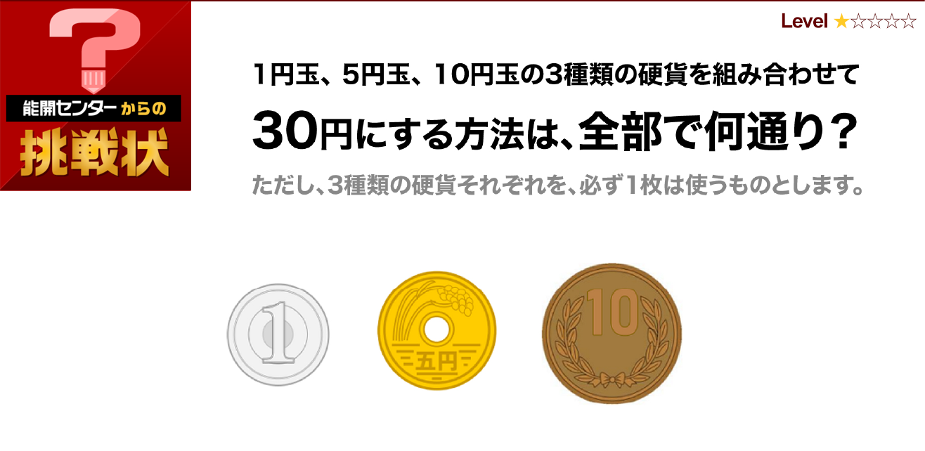 これより、30円にするために必要な硬貨の組み合わせは、条件の硬貨を1枚ずつ合わせた