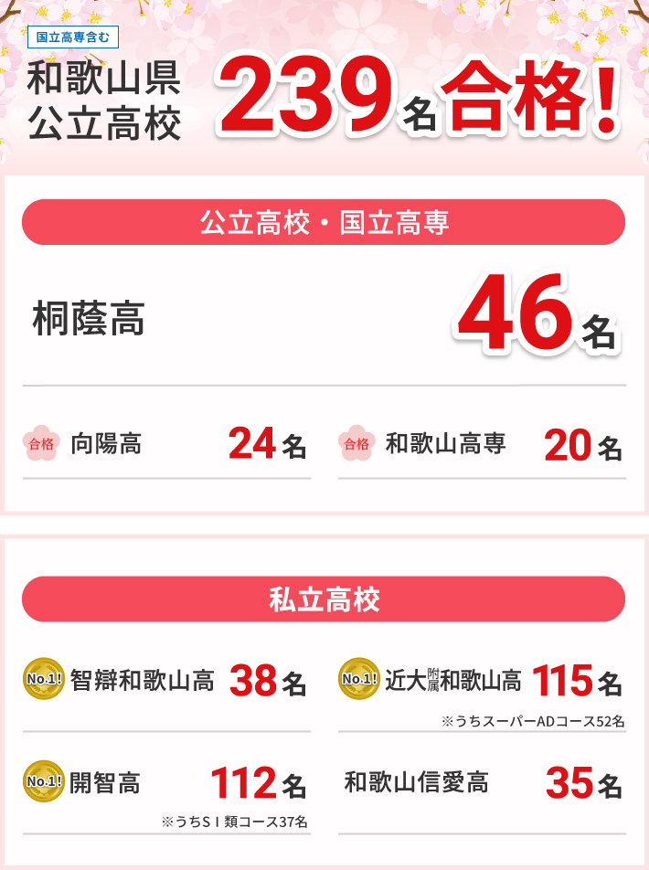 和歌山校(私立中受)・和歌山校(県立中受・高受)・小松原校・紀ノ川北校・岩出校・橋本校・箕島校・御坊校・田辺校 -